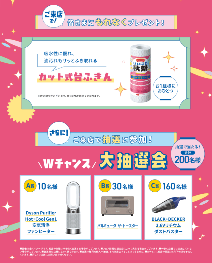 ご来場だけでなく、抽選で「ダイソンの空気清浄ファンヒーター」や「バルミューダのトースター」など豪華賞品が当たるチャンスも!